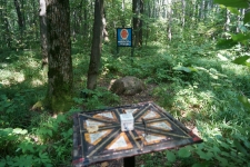 От таблички начинается тропа вглубь рощи к Алтарному камню предков: