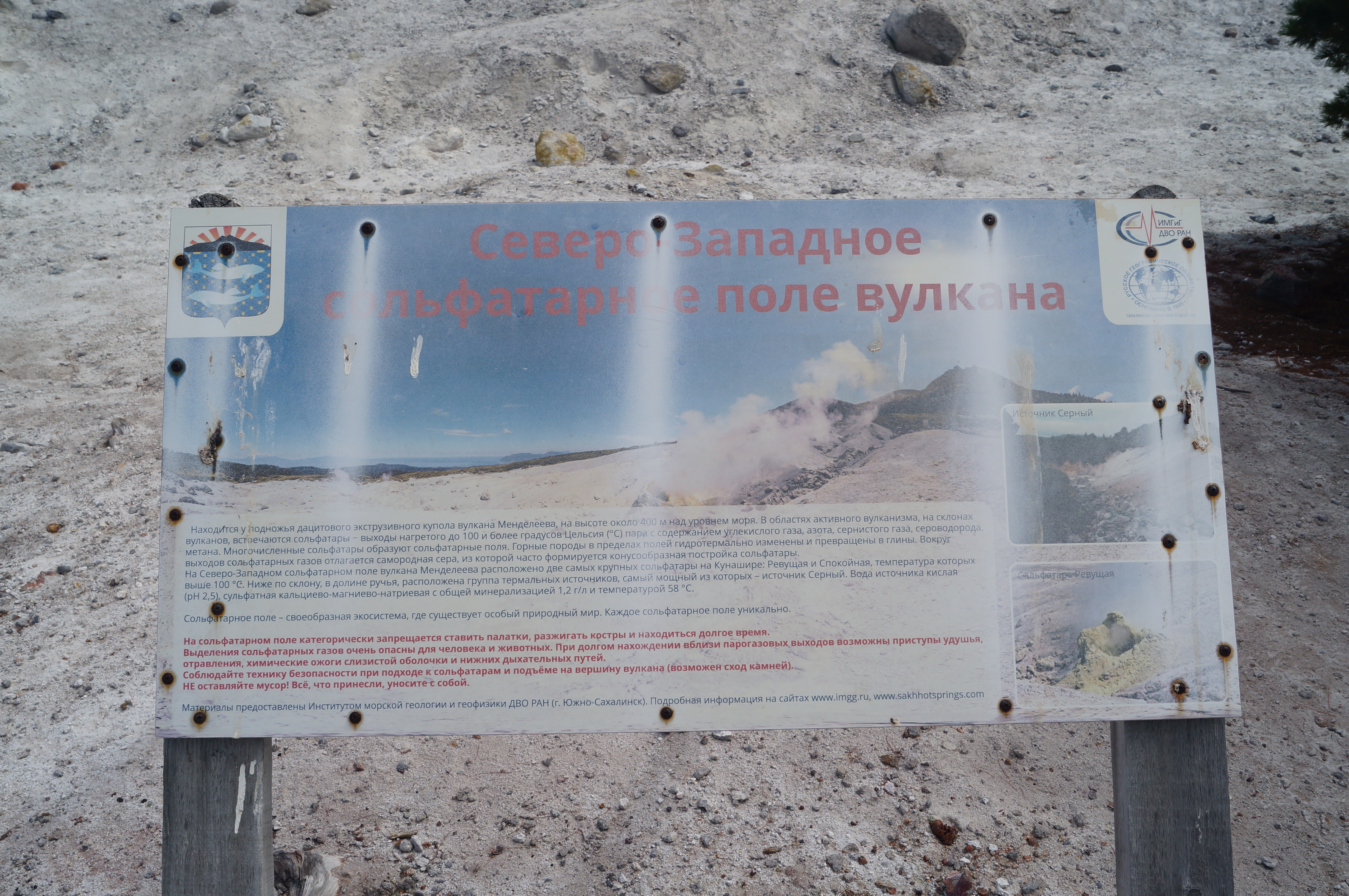 Фотография: Информационный стенд у Северо-Западного Сольфатарного (Фумарольного) поля вулкана Менделеева. Для прочтения нажать на лупу под фото